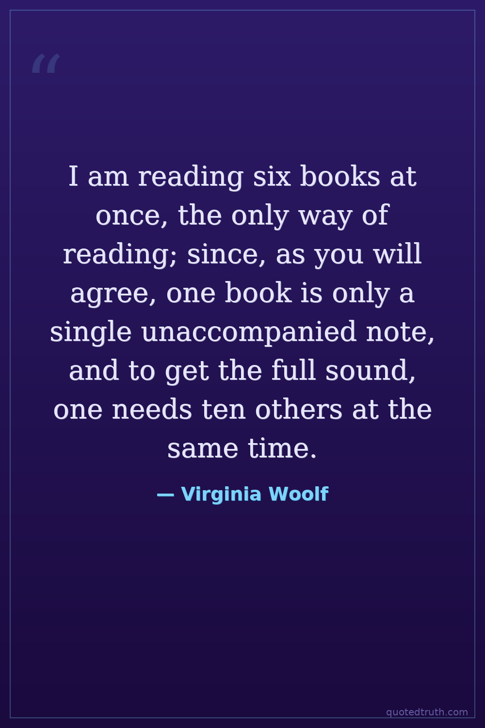 I am reading six books at once, the only way of reading; since, as you will agree, one book is only a single unaccompanied note, and to get the full sound, one needs ten others at the same time.