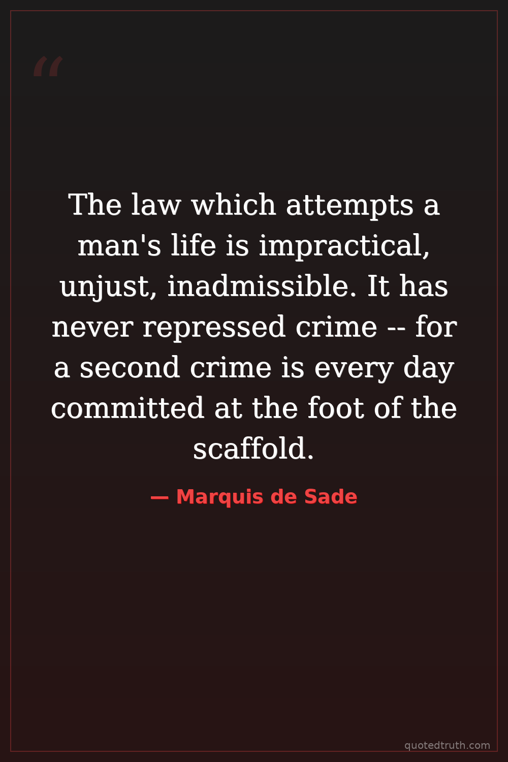 The law which attempts a man's life is impractical, unjust, inadmissible. It has never repressed crime -- for a second crime is every day committed at the foot of the scaffold.