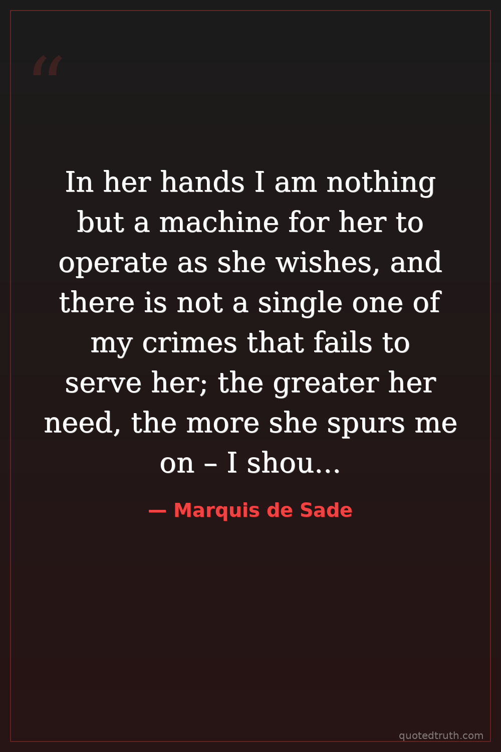 In her hands I am nothing but a machine for her to operate as she wishes, and there is not a single one of my crimes that fails to serve her; the greater her need, the more she spurs me on – I should be a fool to resist her. Only the law stands in my way, but I defy it – my gold and my influence place me beyond the reach of those crude scales meant only for the common people.