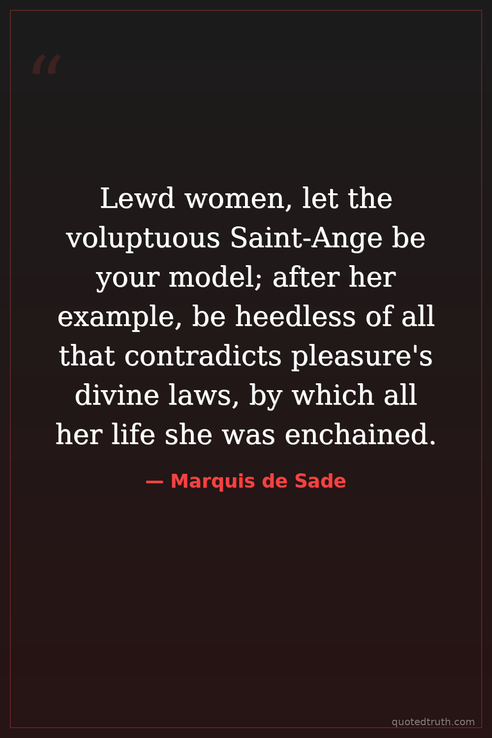 Lewd women, let the voluptuous Saint-Ange be your model; after her example, be heedless of all that contradicts pleasure's divine laws, by which all her life she was enchained.
