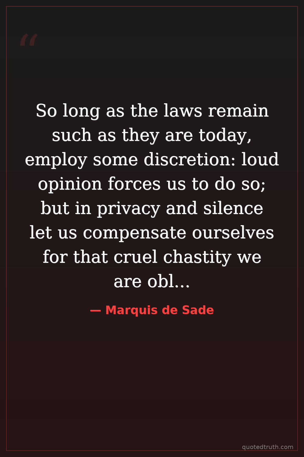 So long as the laws remain such as they are today, employ some discretion: loud opinion forces us to do so; but in privacy and silence let us compensate ourselves for that cruel chastity we are obliged to display in public.