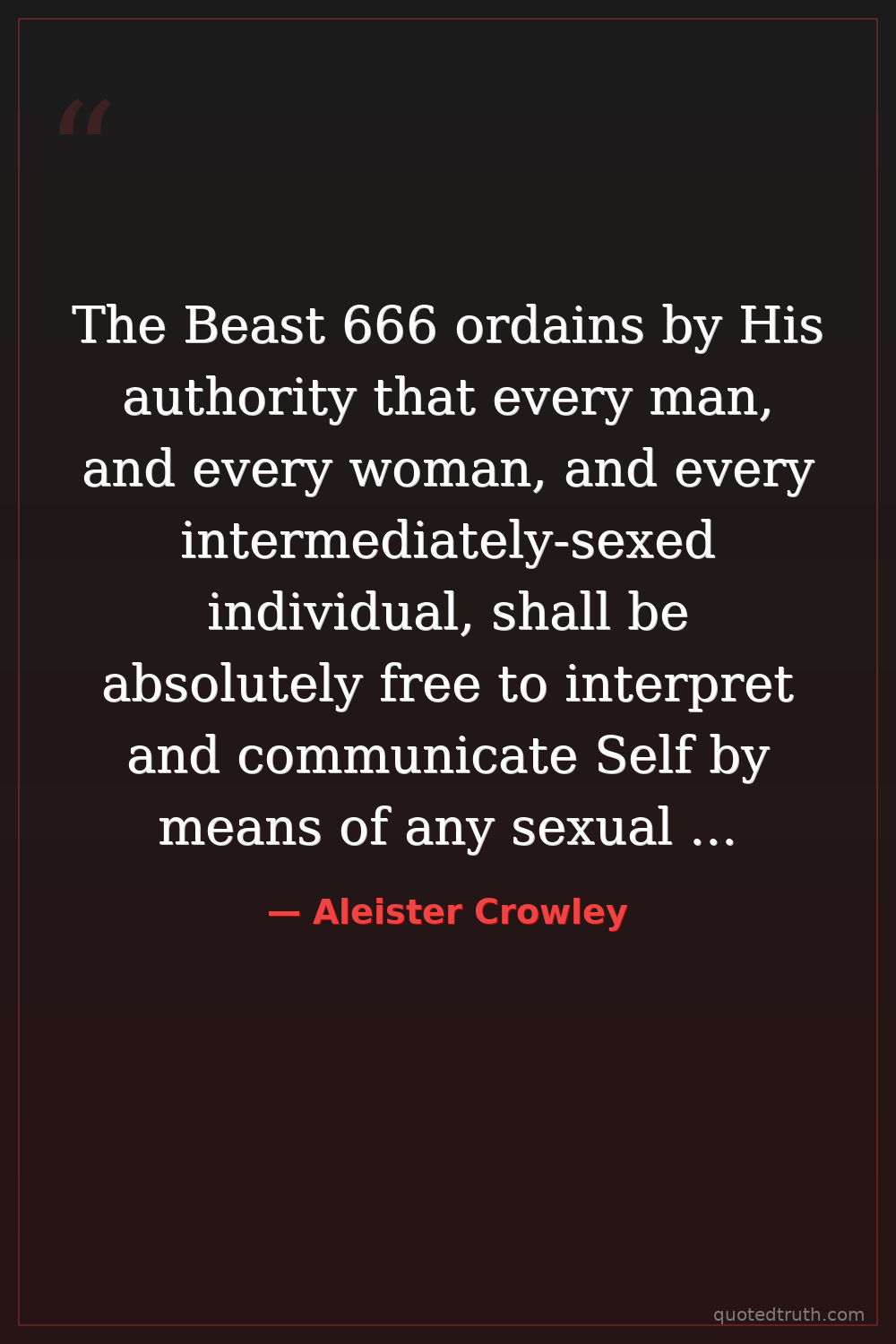 The Beast 666 ordains by His authority that every man, and every woman, and every intermediately-sexed individual, shall be absolutely free to interpret and communicate Self by means of any sexual practices soever, whether direct or indirect, rational or symbolic, physiologically, legally, ethically, or religiously approved or no, provided only that all parties to any act are fully aware of all implications and responsibilities thereof, and heartily agree thereto.