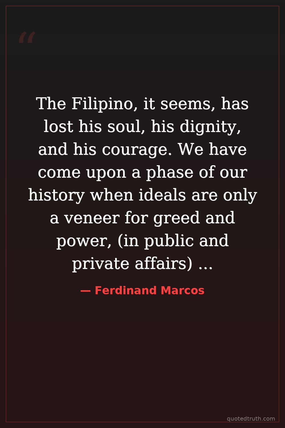 The Filipino, it seems, has lost his soul, his dignity, and his courage. We have come upon a phase of our history when ideals are only a veneer for greed and power, (in public and private affairs) when devotion to duty and dedication to a public trust are to be weighted at all times against private advantages and personal gain, and when loyalties can be traded…Our government is in the iron grip of venality, its treasury is barren, its resources are wasted, its civil service is slothful and indifferent, its armed forces demoralized and its councils sterile. We are in crisis. You know that the government treasury is empty. Only by severe self-denial will there be hope for recovery within the next year…This nation can be great again.