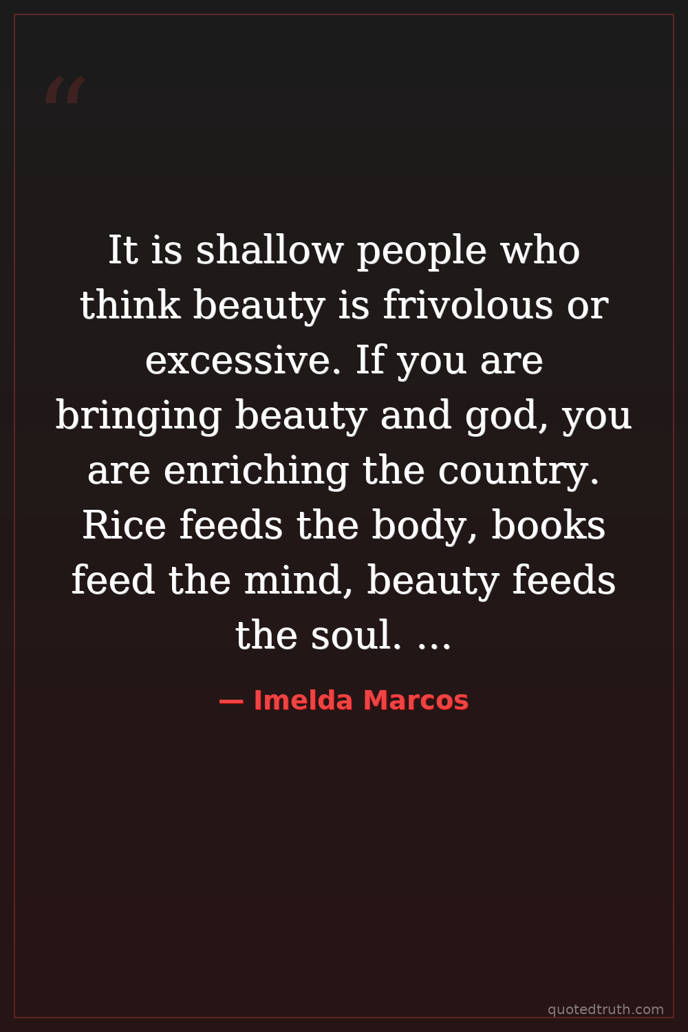 It is shallow people who think beauty is frivolous or excessive. If you are bringing beauty and god, you are enriching the country. Rice feeds the body, books feed the mind, beauty feeds the soul. It is one thing I can really be proud of and stand tall in the world.