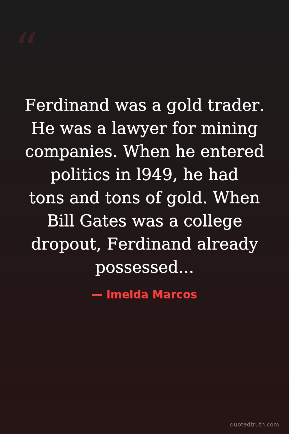 Ferdinand was a gold trader. He was a lawyer for mining companies. When he entered politics in l949, he had tons and tons of gold. When Bill Gates was a college dropout, Ferdinand already possessed billions of dollars and tons of gold. It wasn't stolen.