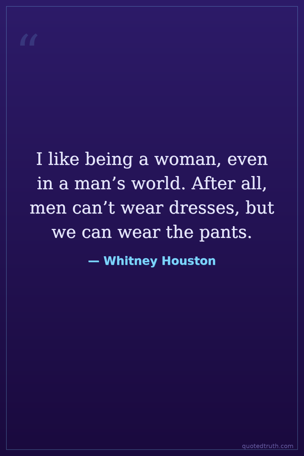 I like being a woman, even in a man’s world. After all, men can’t wear dresses, but we can wear the pants.
