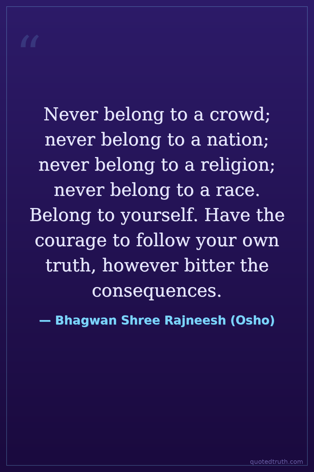 Never belong to a crowd; never belong to a nation; never belong to a religion; never belong to a race. Belong to yourself. Have the courage to follow your own truth, however bitter the consequences.