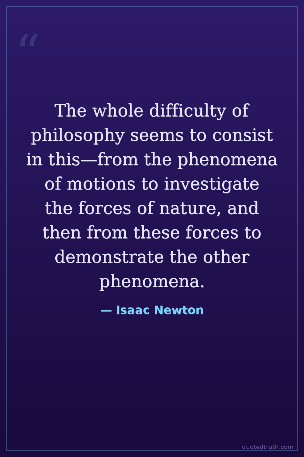 The whole difficulty of philosophy seems to consist in this—from the phenomena of motions to investigate the forces of nature, and then from these forces to demonstrate the other phenomena.