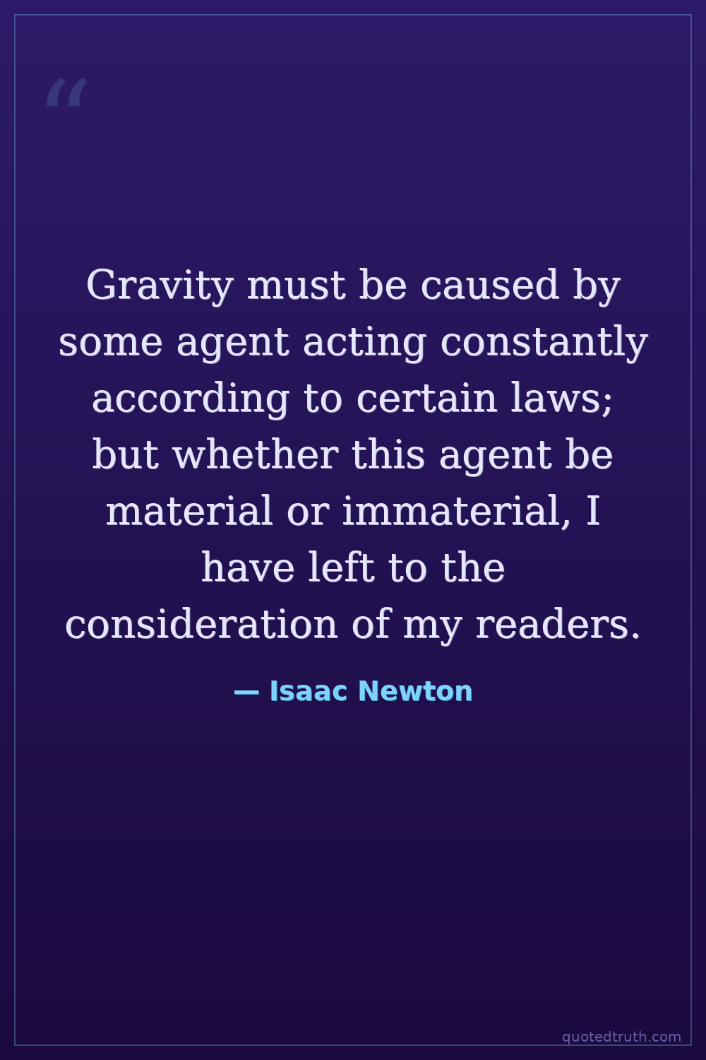 Gravity must be caused by some agent acting constantly according to certain laws; but whether this agent be material or immaterial, I have left to the consideration of my readers.
