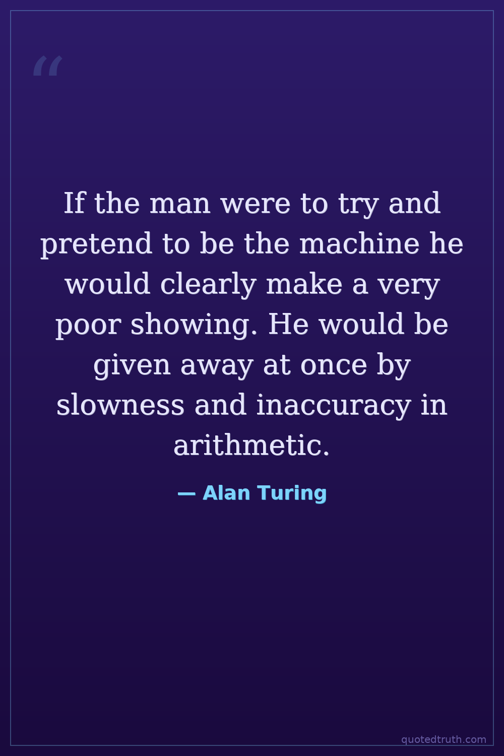 If the man were to try and pretend to be the machine he would clearly make a very poor showing. He would be given away at once by slowness and inaccuracy in arithmetic.