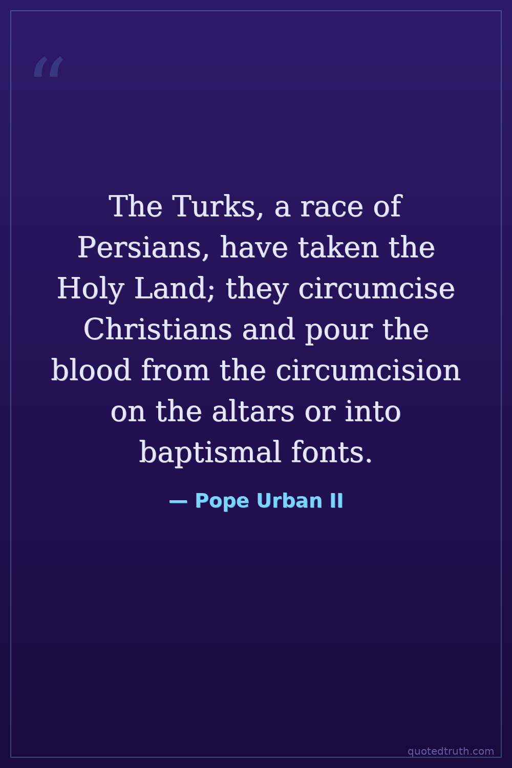The Turks, a race of Persians, have taken the Holy Land; they circumcise Christians and pour the blood from the circumcision on the altars or into baptismal fonts.