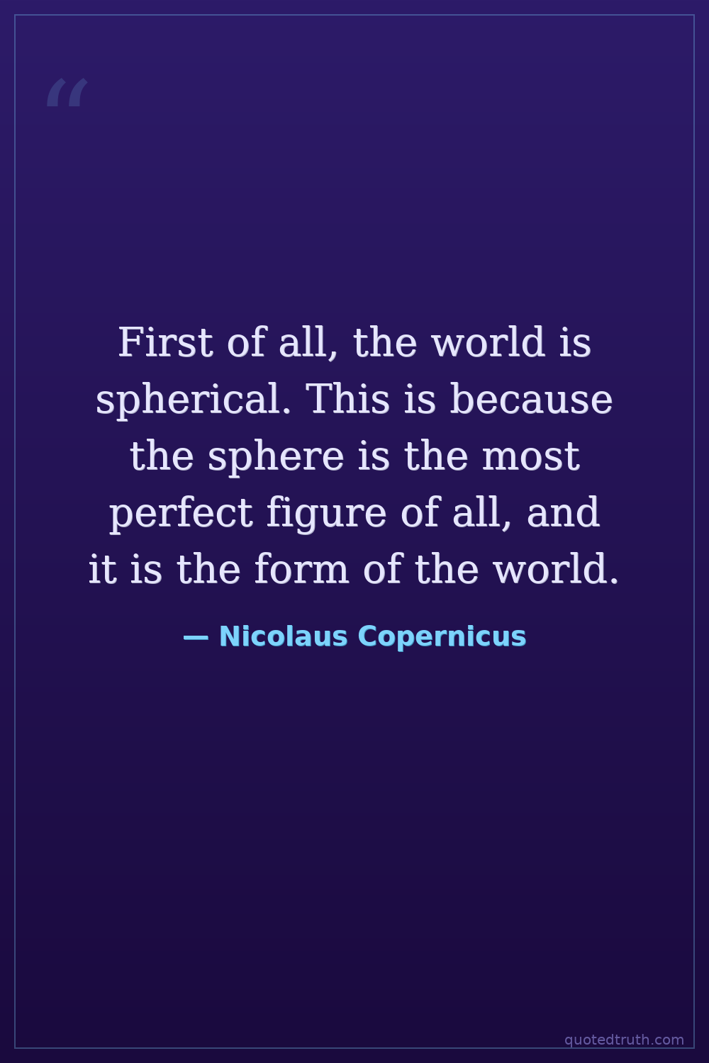 First of all, the world is spherical. This is because the sphere is the most perfect figure of all, and it is the form of the world.