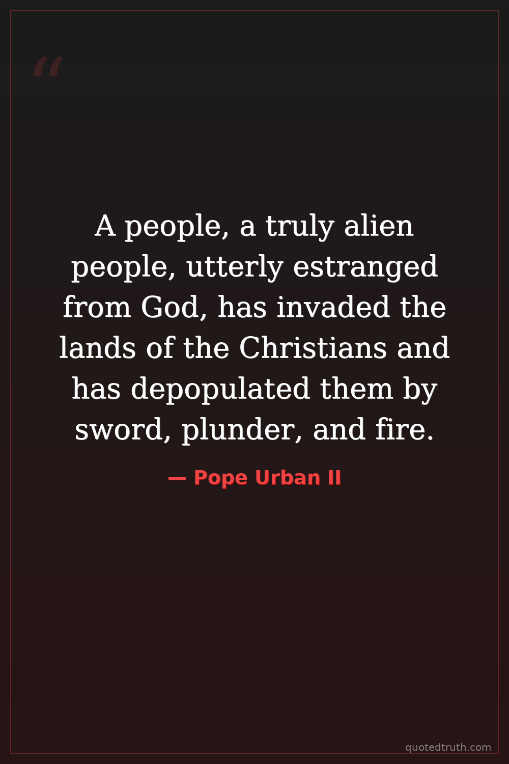 A people, a truly alien people, utterly estranged from God, has invaded the lands of the Christians and has depopulated them by sword, plunder, and fire.