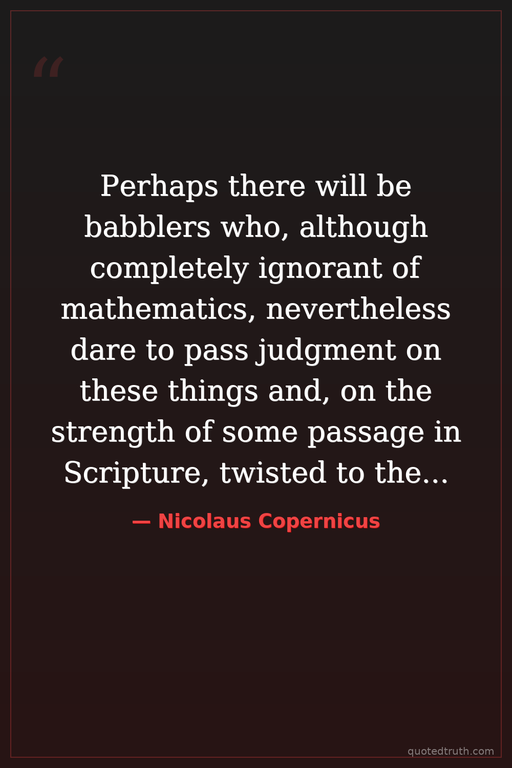 Perhaps there will be babblers who, although completely ignorant of mathematics, nevertheless dare to pass judgment on these things and, on the strength of some passage in Scripture, twisted to their purpose, will presume to condemn and censure my undertaking.