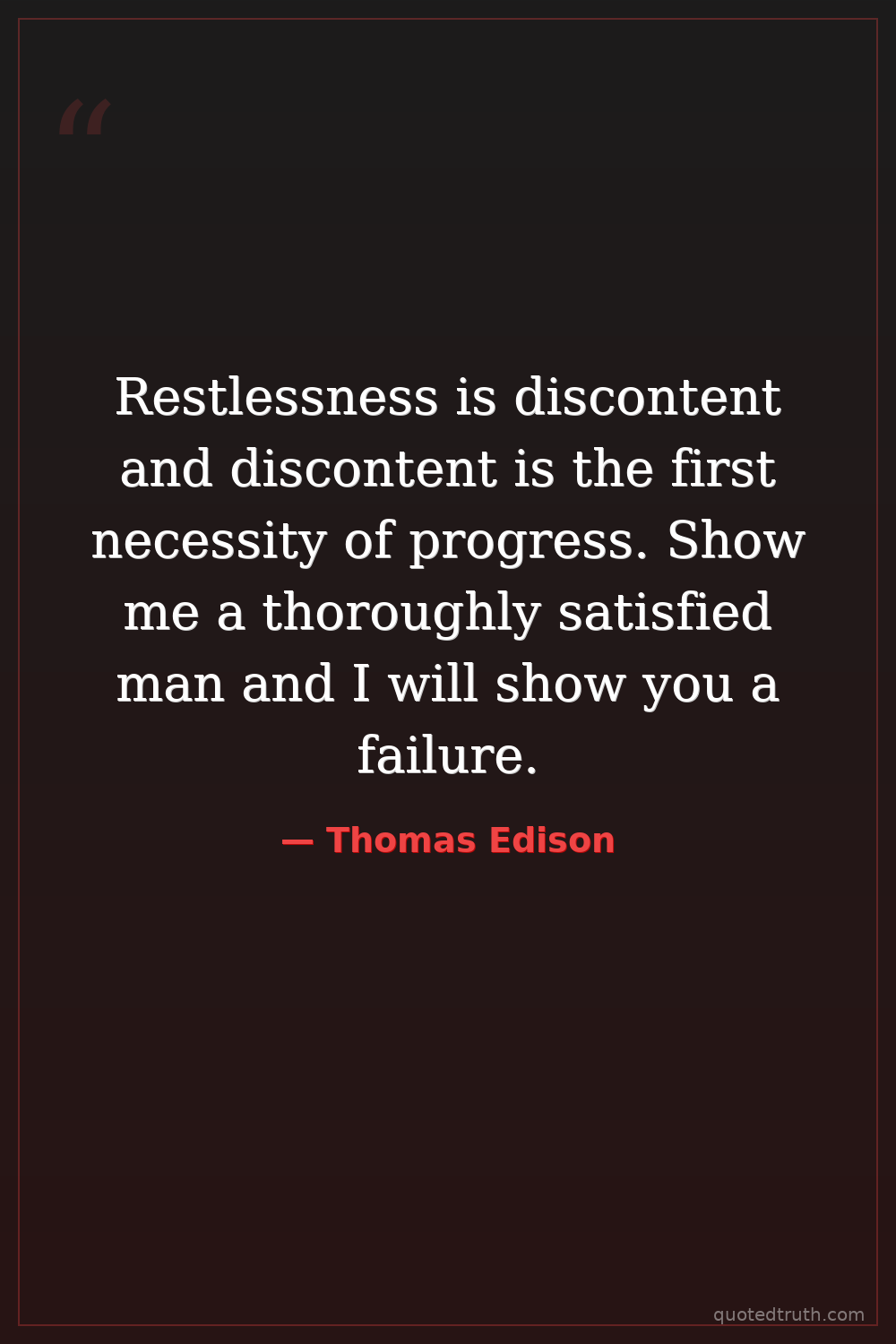Restlessness is discontent and discontent is the first necessity of progress. Show me a thoroughly satisfied man and I will show you a failure.
