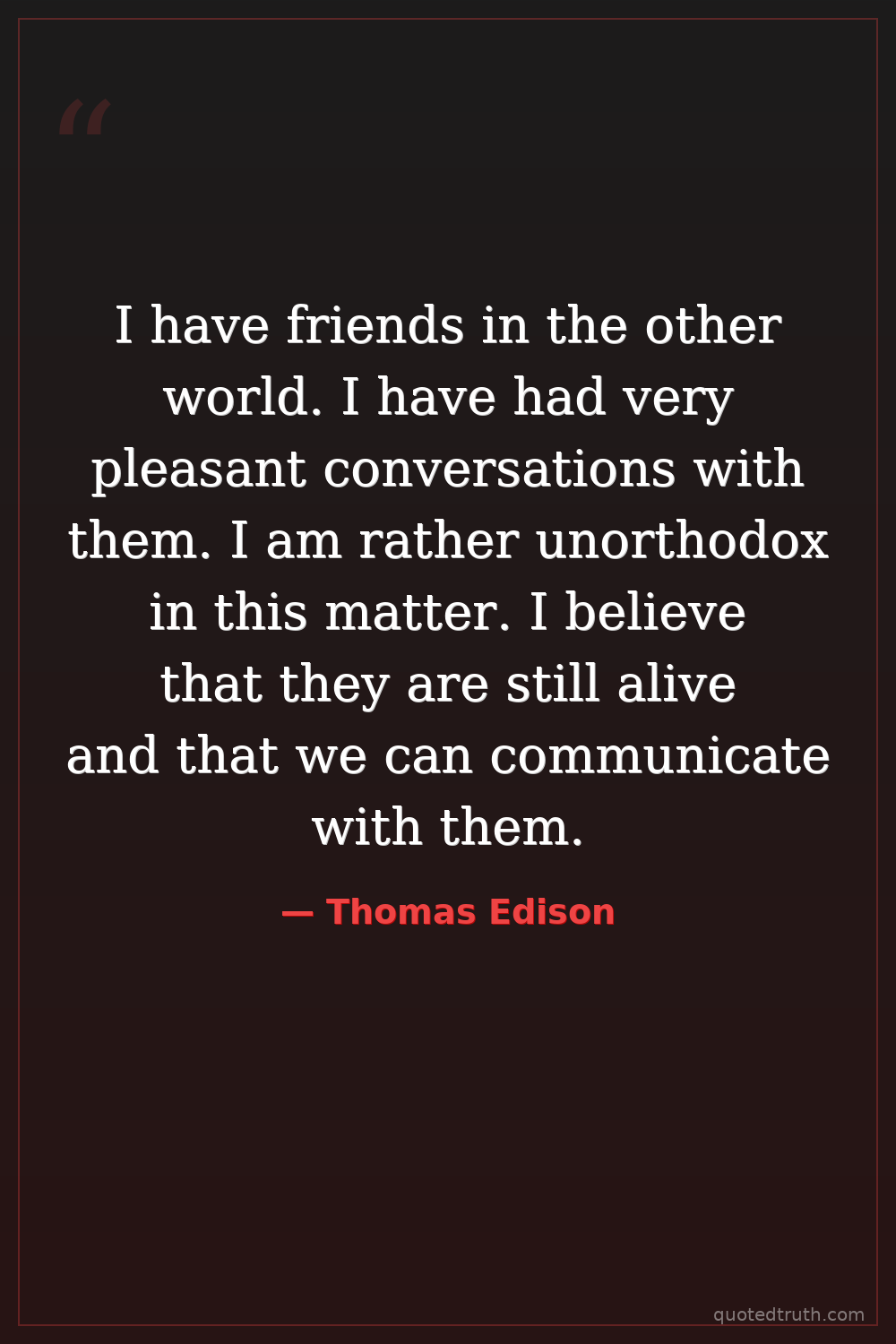 I have friends in the other world. I have had very pleasant conversations with them. I am rather unorthodox in this matter. I believe that they are still alive and that we can communicate with them.