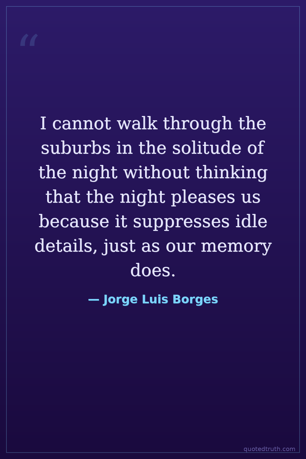 I cannot walk through the suburbs in the solitude of the night without thinking that the night pleases us because it suppresses idle details, just as our memory does.
