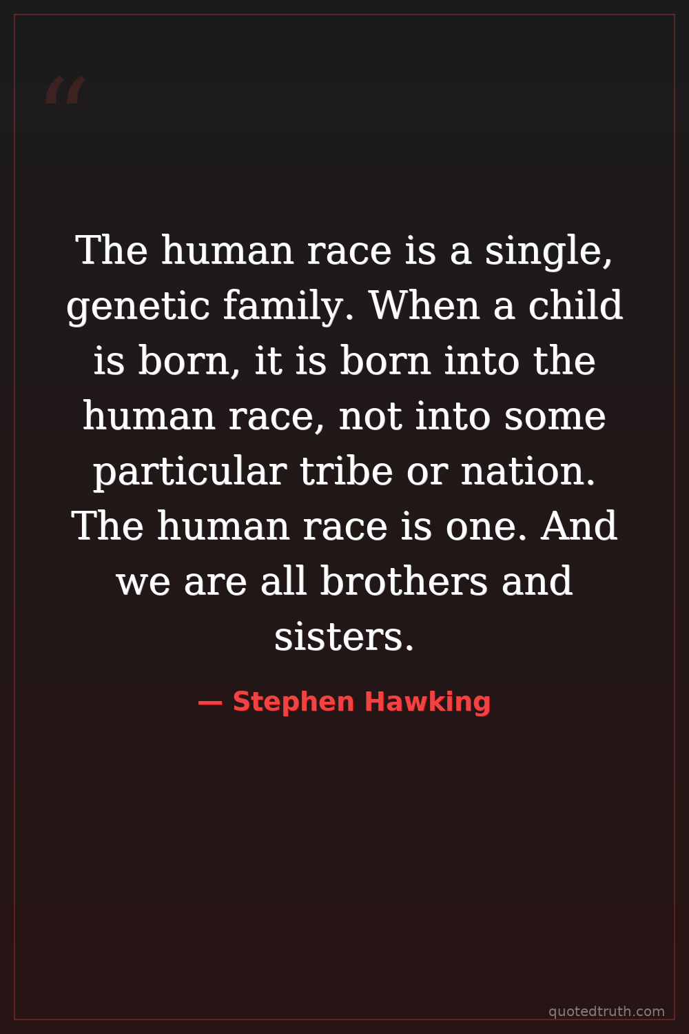 The human race is a single, genetic family. When a child is born, it is born into the human race, not into some particular tribe or nation. The human race is one. And we are all brothers and sisters.