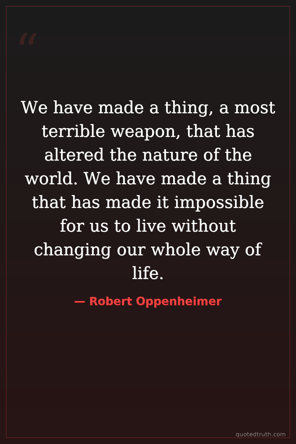 We have made a thing, a most terrible weapon, that has altered the nature of the world. We have made a thing that has made it impossible for us to live without changing our whole way of life.