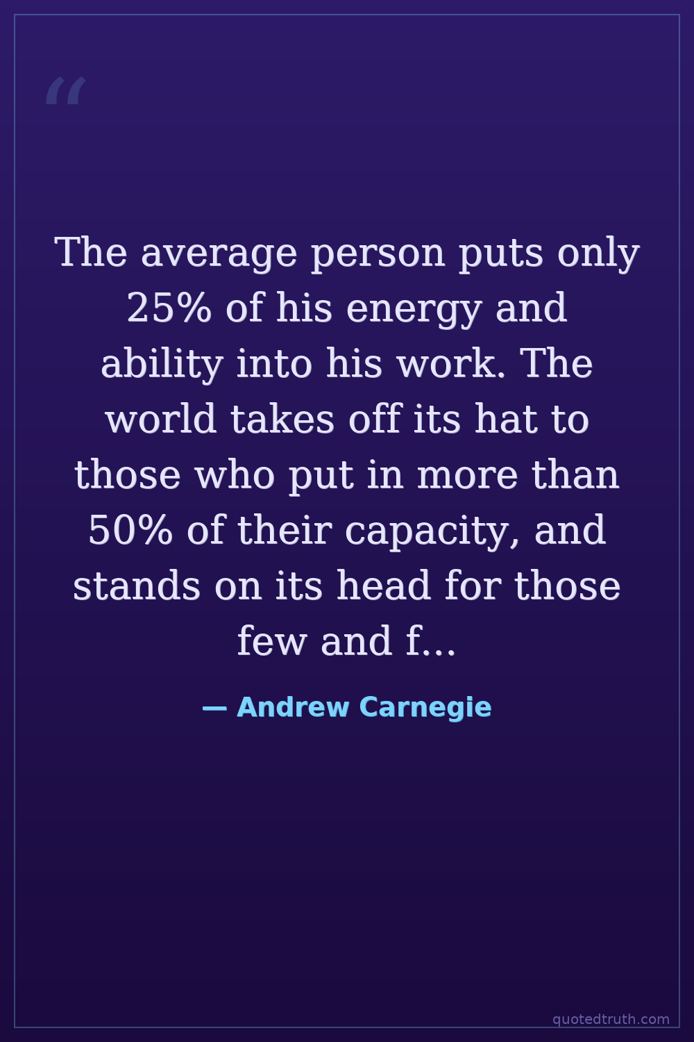 The average person puts only 25% of his energy and ability into his work. The world takes off its hat to those who put in more than 50% of their capacity, and stands on its head for those few and far between souls who devote 100%.