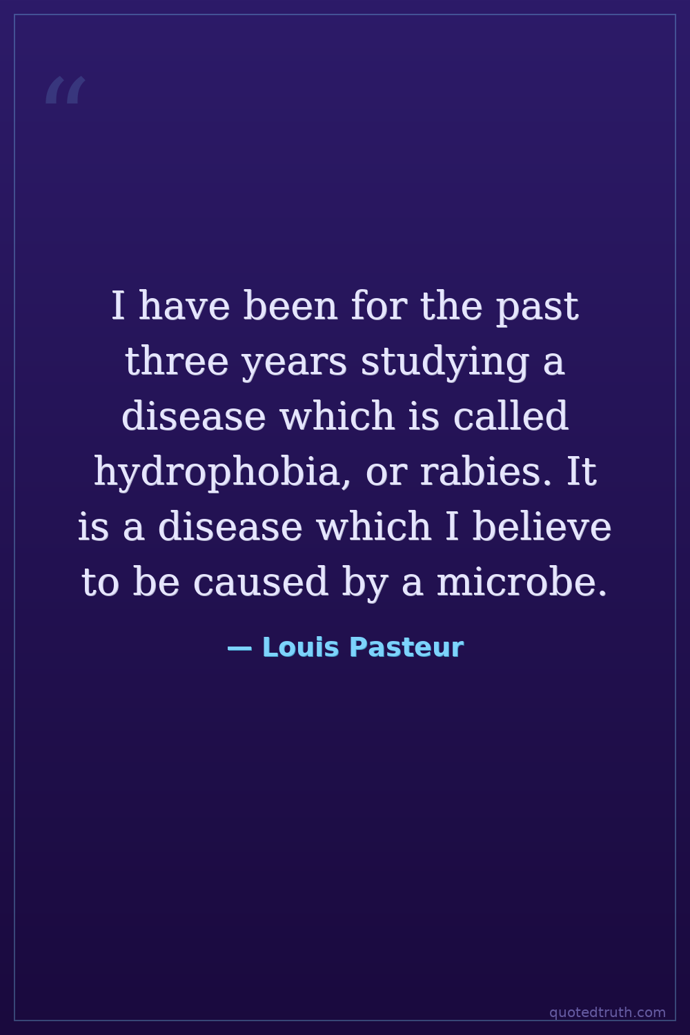 I have been for the past three years studying a disease which is called hydrophobia, or rabies. It is a disease which I believe to be caused by a microbe.