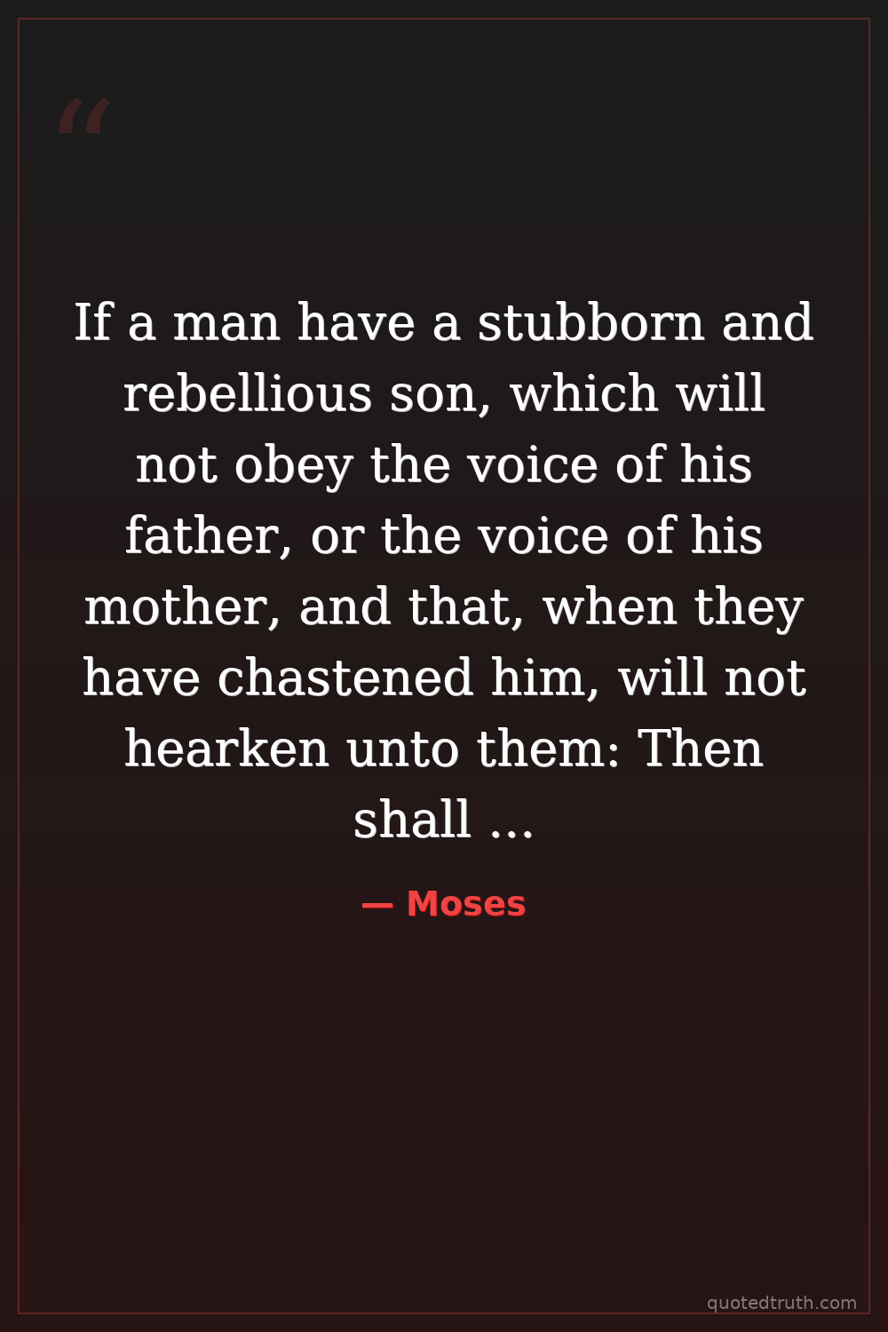 If a man have a stubborn and rebellious son, which will not obey the voice of his father, or the voice of his mother, and that, when they have chastened him, will not hearken unto them: Then shall his father and his mother lay hold on him, and bring him out unto the elders of his city, and unto the gate of his place; And they shall say unto the elders of his city, This our son is stubborn and rebellious, he will not obey our voice; he is a glutton, and a drunkard. And all the men of his city shall stone him with stones, that he die: so shalt thou put evil away from among you; and all Israel shall hear, and fear.