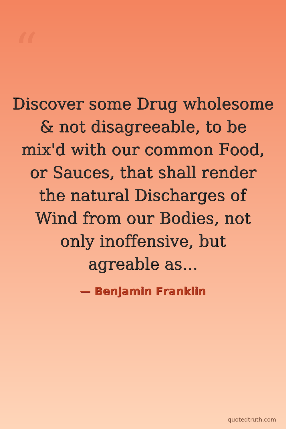 Discover some Drug wholesome & not disagreeable, to be mix'd with our common Food, or Sauces, that shall render the natural Discharges of Wind from our Bodies, not only inoffensive, but agreable as Perfumes.