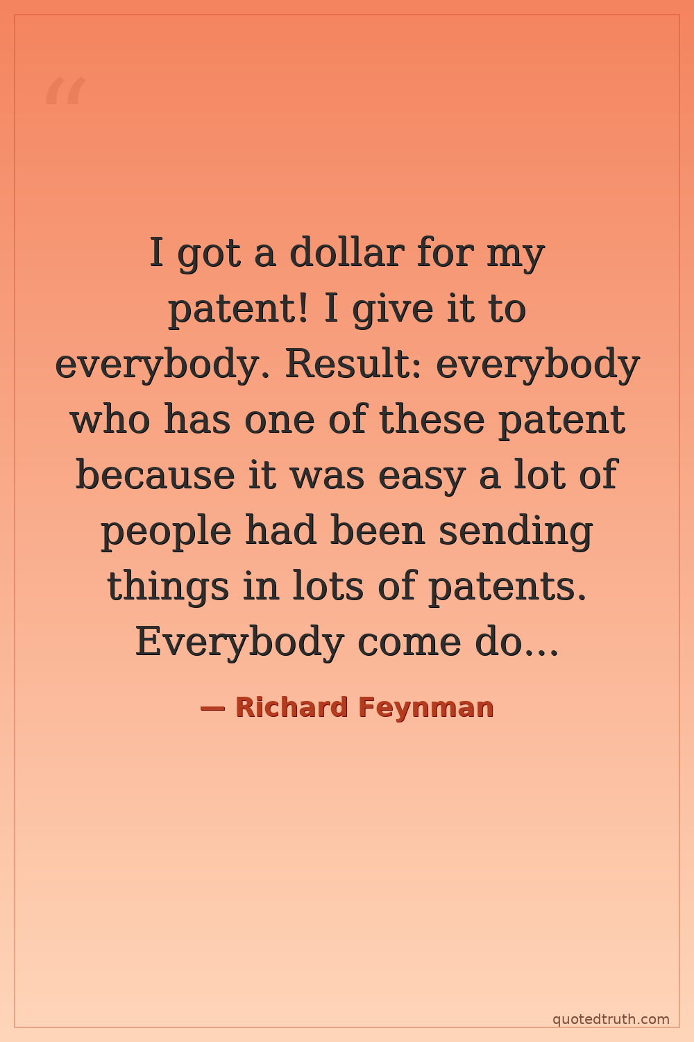 I got a dollar for my patent! I give it to everybody. Result: everybody who has one of these patent because it was easy a lot of people had been sending things in lots of patents. Everybody come down they want their dollar. He starts shelling them out of his pocket then he realizes, it's going to be a hemorrhage.