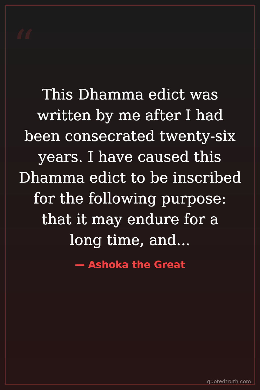 This Dhamma edict was written by me after I had been consecrated twenty-six years. I have caused this Dhamma edict to be inscribed for the following purpose: that it may endure for a long time, and that my sons and grandsons and great-grandsons may follow it and live according to it.