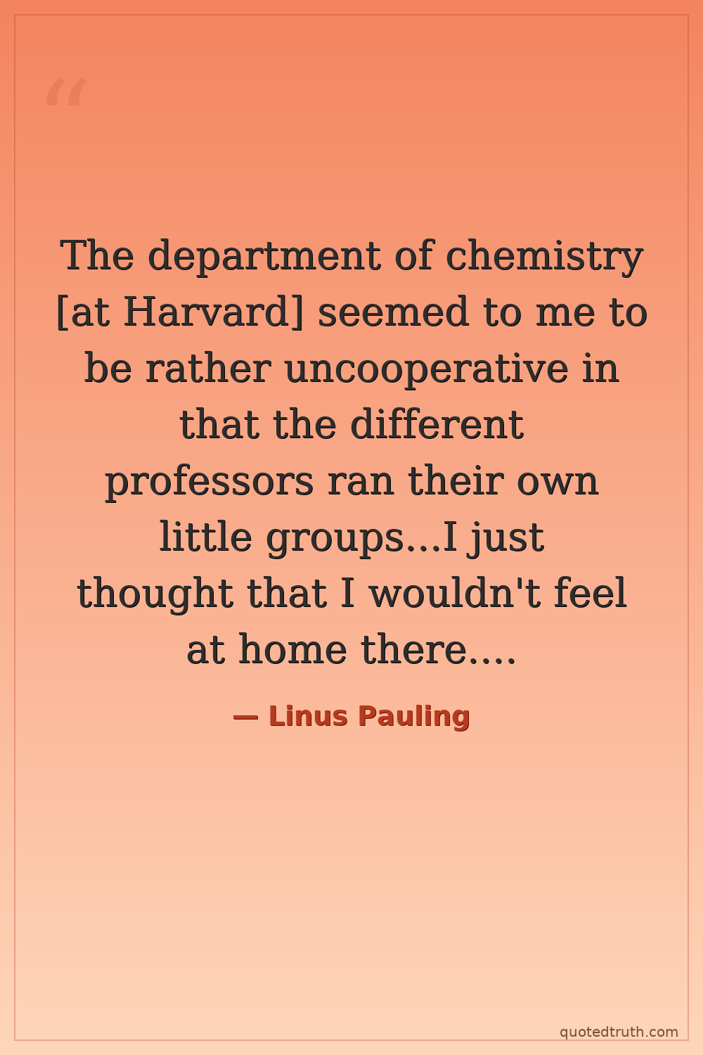 The department of chemistry [at Harvard] seemed to me to be rather uncooperative in that the different professors ran their own little groups...I just thought that I wouldn't feel at home there....