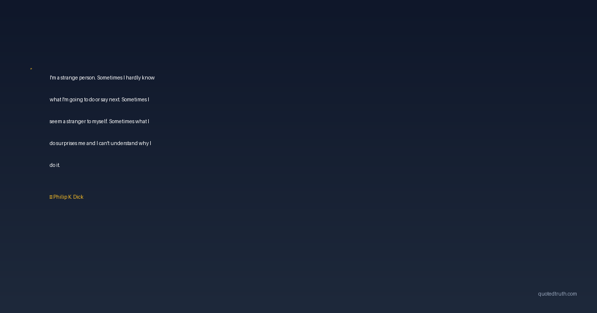 I'm a strange person. Sometimes I hardly know what I'm going to do or say next. Sometimes I seem a stranger to myself. Sometimes what I do surprises me and I can't understand why I do it.