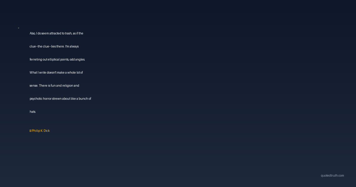 Also, I do seem attracted to trash, as if the clue--the clue--lies there. I'm always ferreting out elliptical points, odd angles. What I write doesn't make a whole lot of sense. There is fun and religion and psychotic horror strewn about like a bunch of hats.
