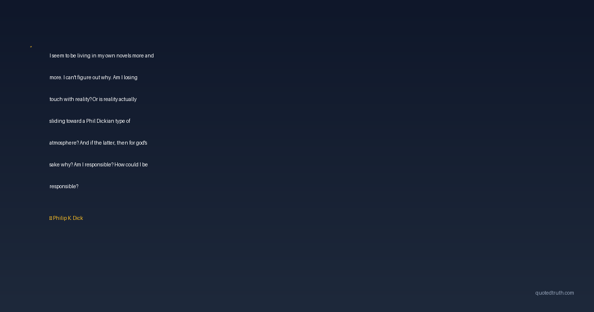 I seem to be living in my own novels more and more. I can't figure out why. Am I losing touch with reality? Or is reality actually sliding toward a Phil Dickian type of atmosphere? And if the latter, then for god's sake why? Am I responsible? How could I be responsible?