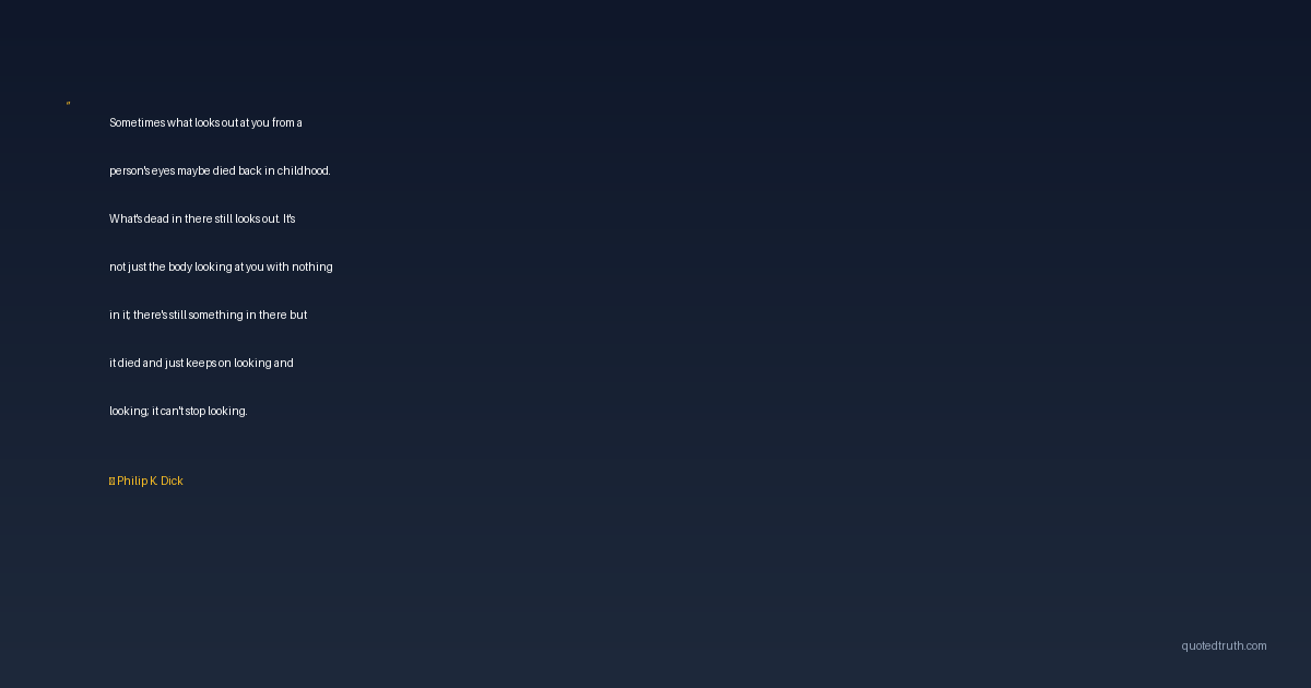 Sometimes what looks out at you from a person's eyes maybe died back in childhood. What's dead in there still looks out. It's not just the body looking at you with nothing in it; there's still something in there but it died and just keeps on looking and looking; it can't stop looking.