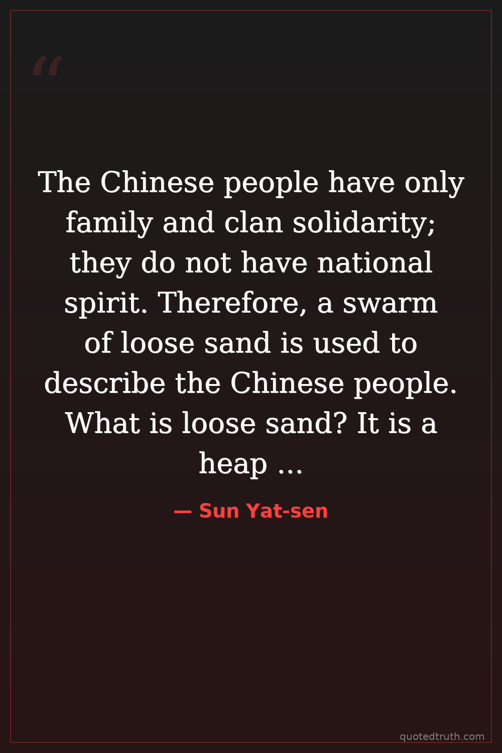 The Chinese people have only family and clan solidarity; they do not have national spirit. Therefore, a swarm of loose sand is used to describe the Chinese people. What is loose sand? It is a heap of sand which has no cohesion. When the Chinese people are compared to a heap of loose sand, it is certainly no compliment.