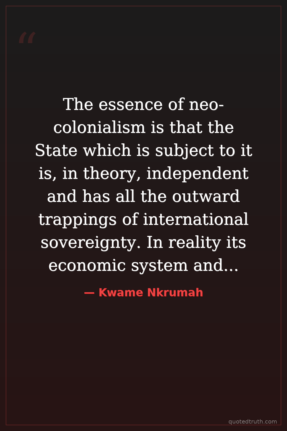 The essence of neo-colonialism is that the State which is subject to it is, in theory, independent and has all the outward trappings of international sovereignty. In reality its economic system and thus its political policy is directed from outside.