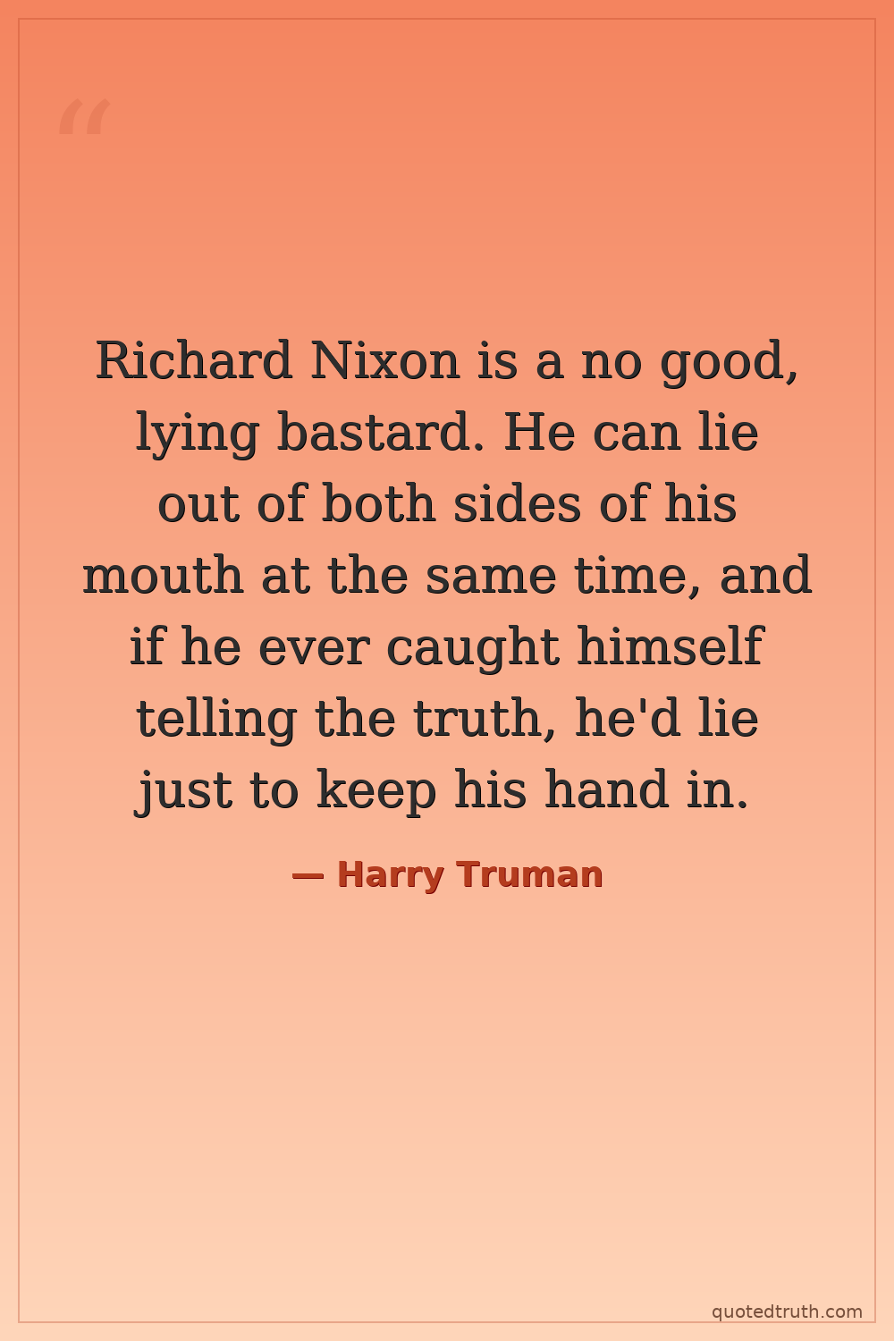 Richard Nixon is a no good, lying bastard. He can lie out of both sides of his mouth at the same time, and if he ever caught himself telling the truth, he'd lie just to keep his hand in.