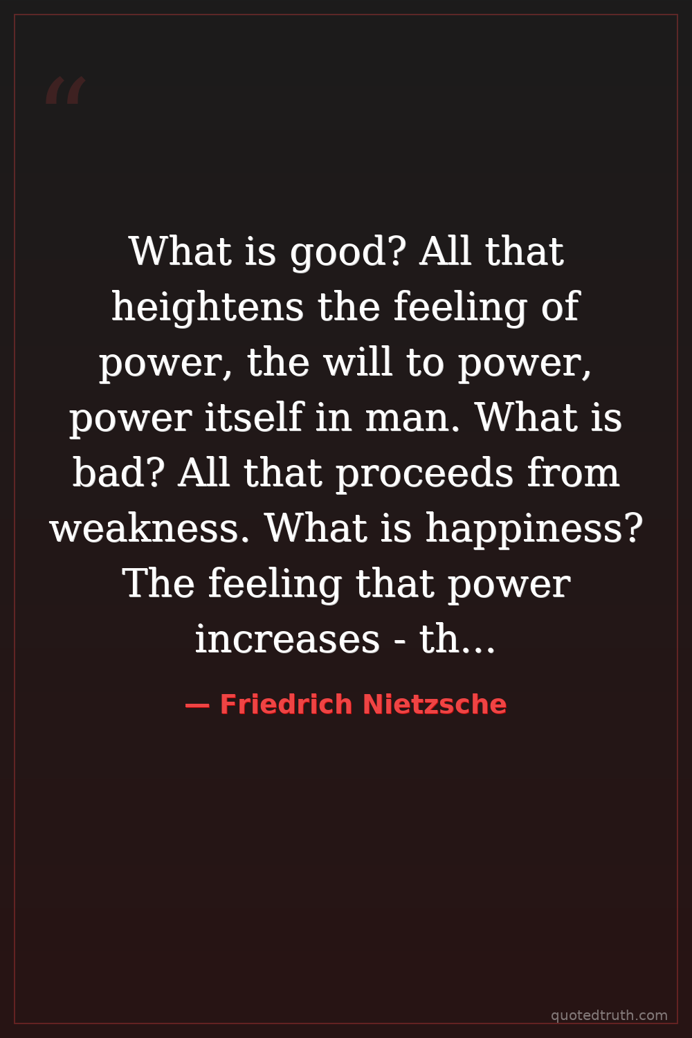 What is good? All that heightens the feeling of power, the will to power, power itself in man. What is bad? All that proceeds from weakness. What is happiness? The feeling that power increases - that a resistance is overcome. — Friedrich Nietzsche Modern God is dead, existentialism