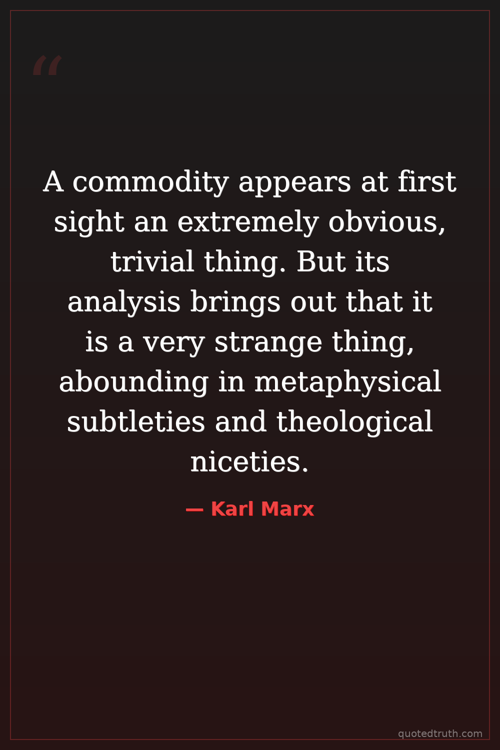 A commodity appears at first sight an extremely obvious, trivial thing. But its analysis brings out that it is a very strange thing, abounding in metaphysical subtleties and theological niceties.