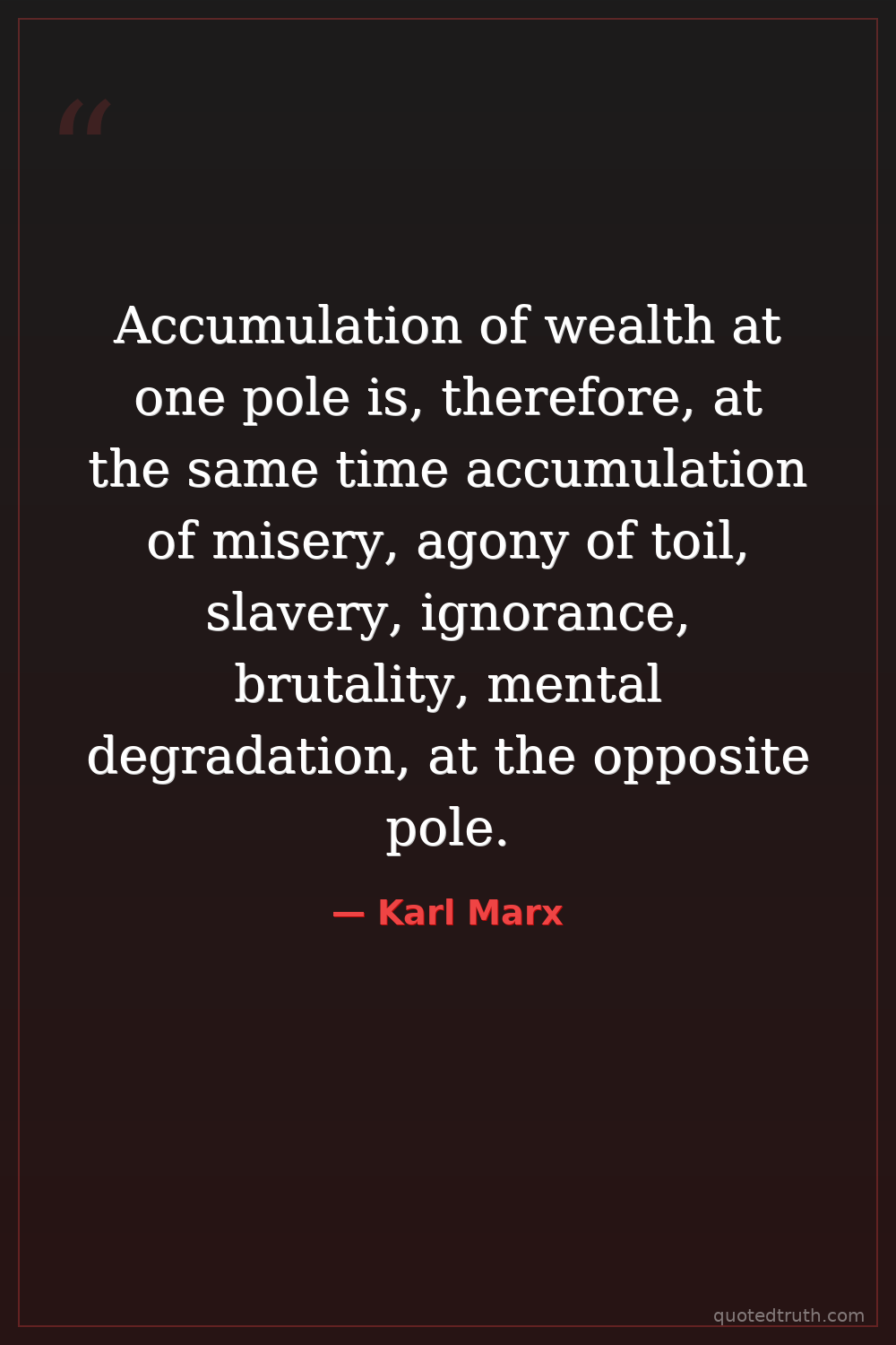 Accumulation of wealth at one pole is, therefore, at the same time accumulation of misery, agony of toil, slavery, ignorance, brutality, mental degradation, at the opposite pole.