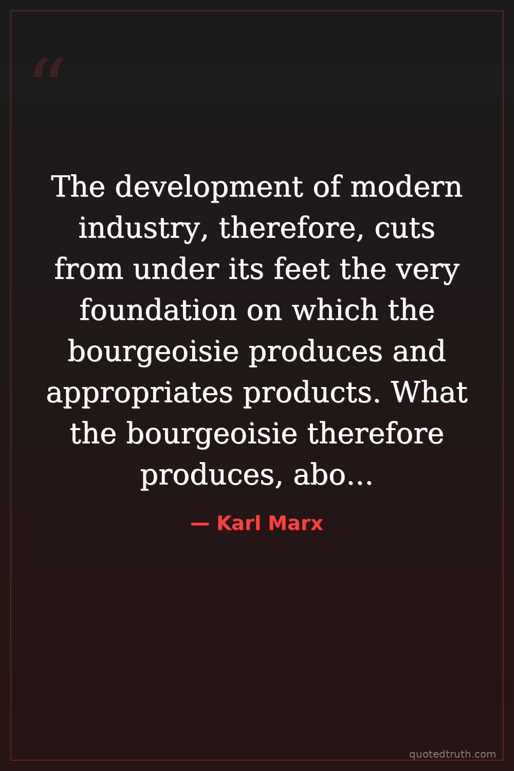 The development of modern industry, therefore, cuts from under its feet the very foundation on which the bourgeoisie produces and appropriates products. What the bourgeoisie therefore produces, above all, are its own grave-diggers. Its fall and the victory of the proletariat are equally inevitable.