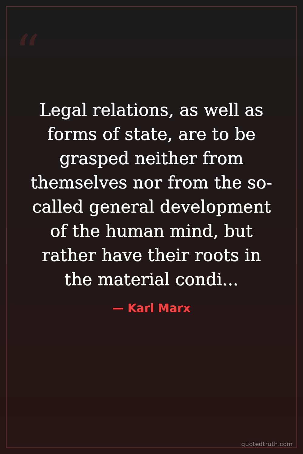 Legal relations, as well as forms of state, are to be grasped neither from themselves nor from the so-called general development of the human mind, but rather have their roots in the material conditions of life.