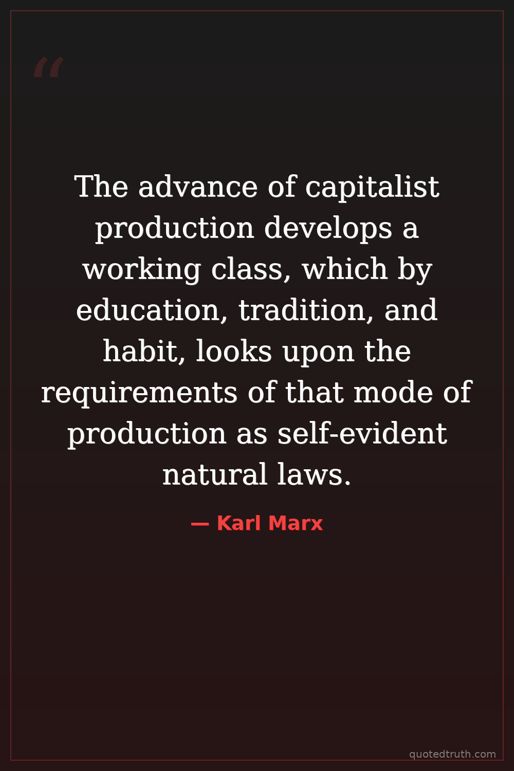 The advance of capitalist production develops a working class, which by education, tradition, and habit, looks upon the requirements of that mode of production as self-evident natural laws.