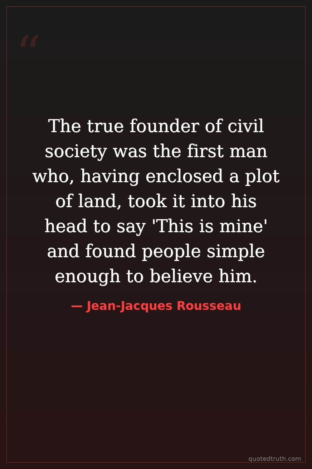 The true founder of civil society was the first man who, having enclosed a plot of land, took it into his head to say 'This is mine' and found people simple enough to believe him.