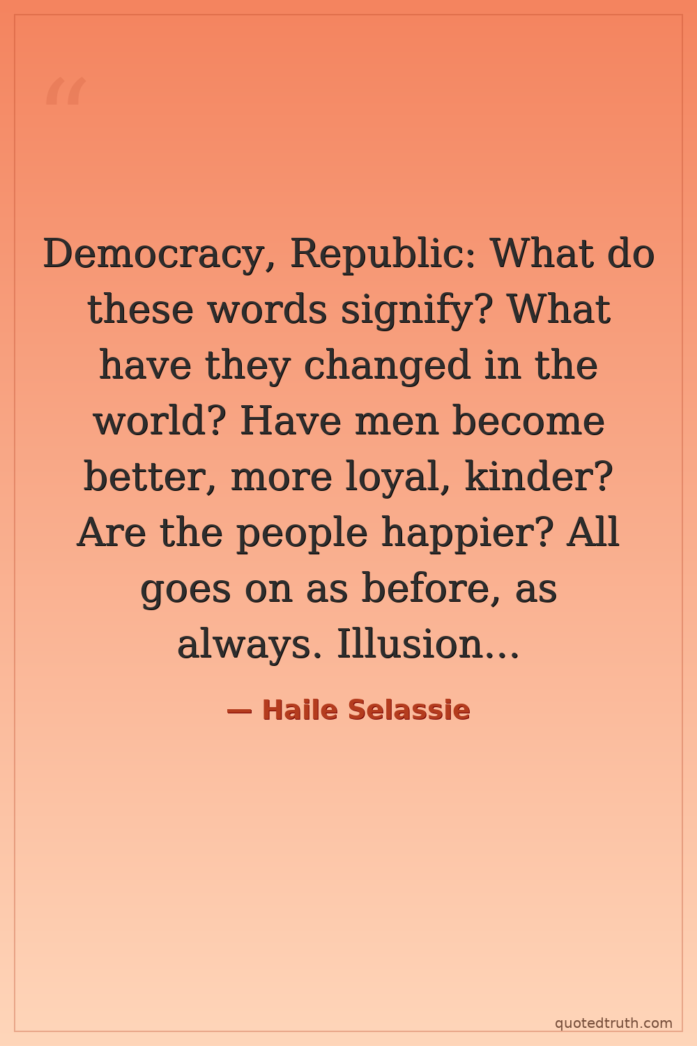 Democracy, Republic: What do these words signify? What have they changed in the world? Have men become better, more loyal, kinder? Are the people happier? All goes on as before, as always. Illusions, illusions.