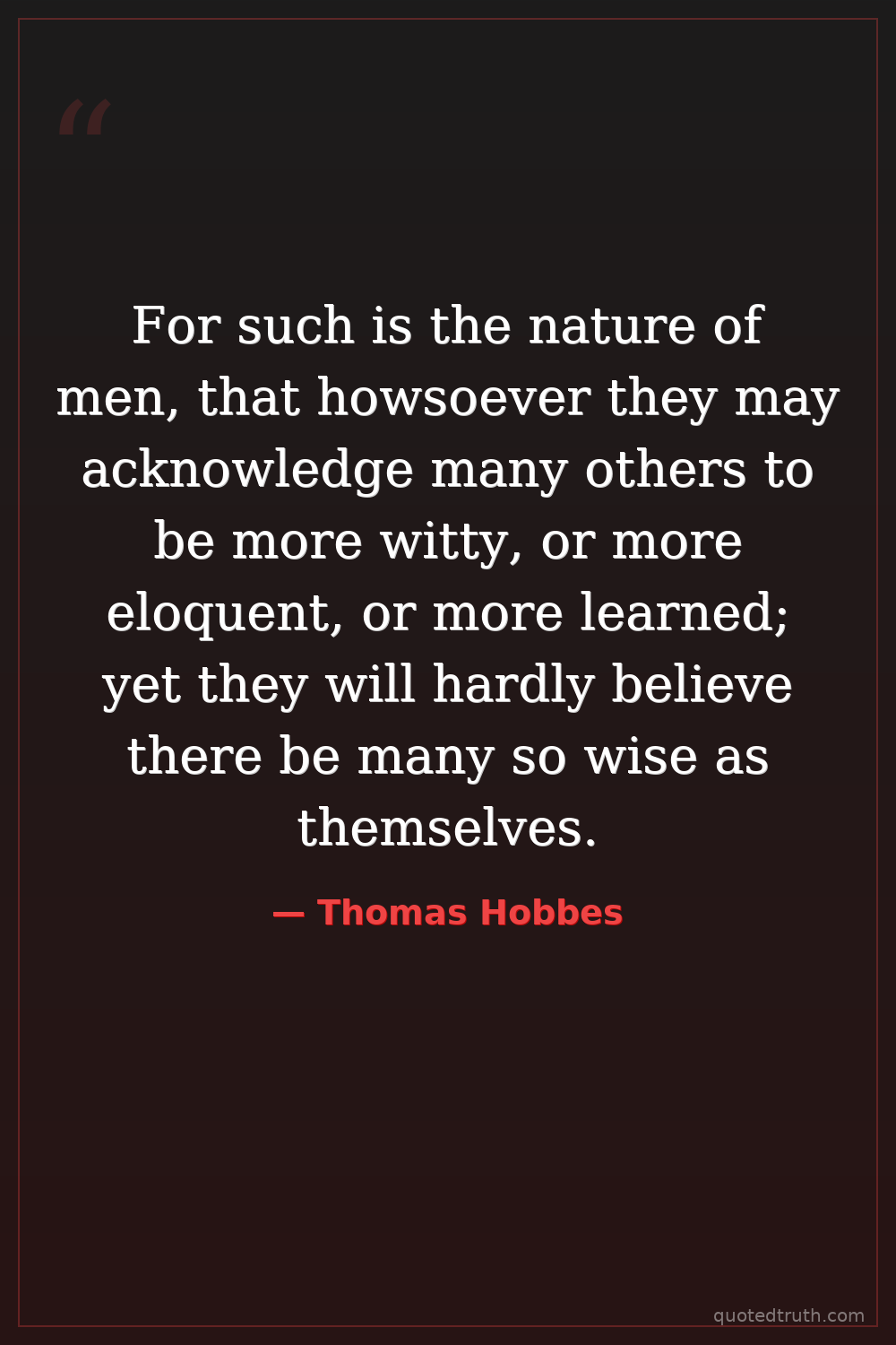 For such is the nature of men, that howsoever they may acknowledge many others to be more witty, or more eloquent, or more learned; yet they will hardly believe there be many so wise as themselves.