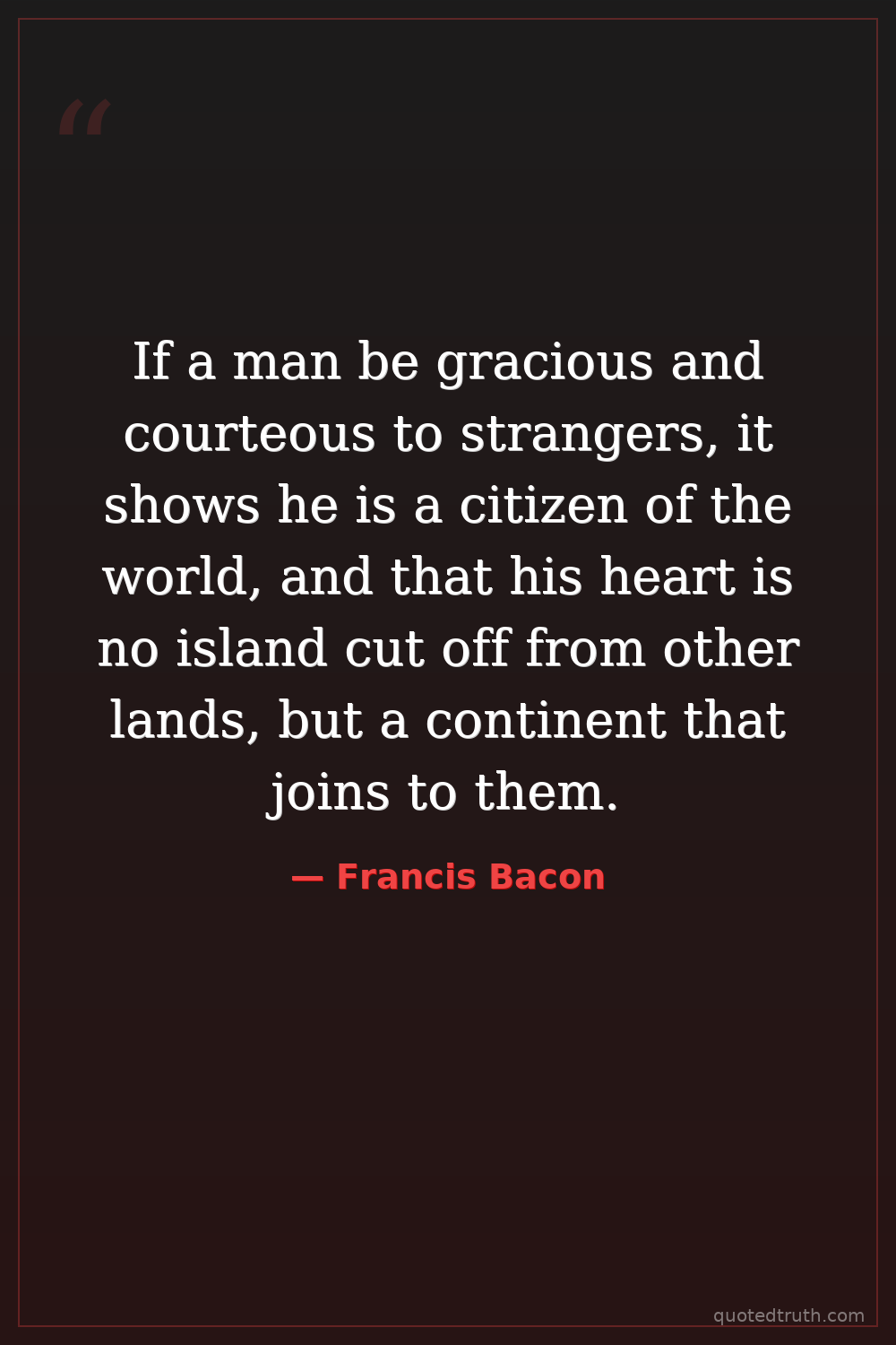 If a man be gracious and courteous to strangers, it shows he is a citizen of the world, and that his heart is no island cut off from other lands, but a continent that joins to them.