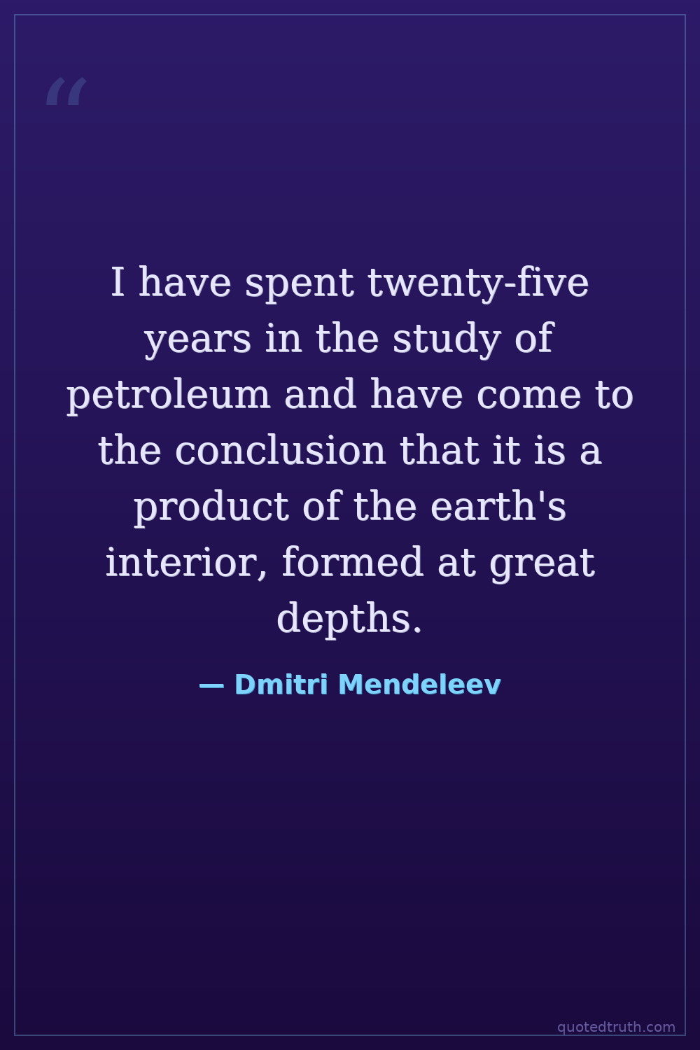 I have spent twenty-five years in the study of petroleum and have come to the conclusion that it is a product of the earth's interior, formed at great depths.