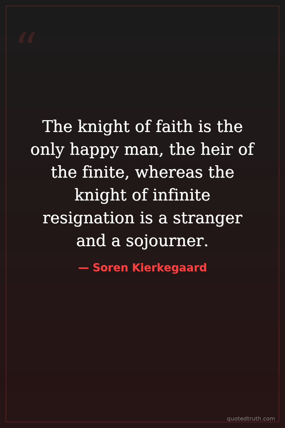 The knight of faith is the only happy man, the heir of the finite, whereas the knight of infinite resignation is a stranger and a sojourner.