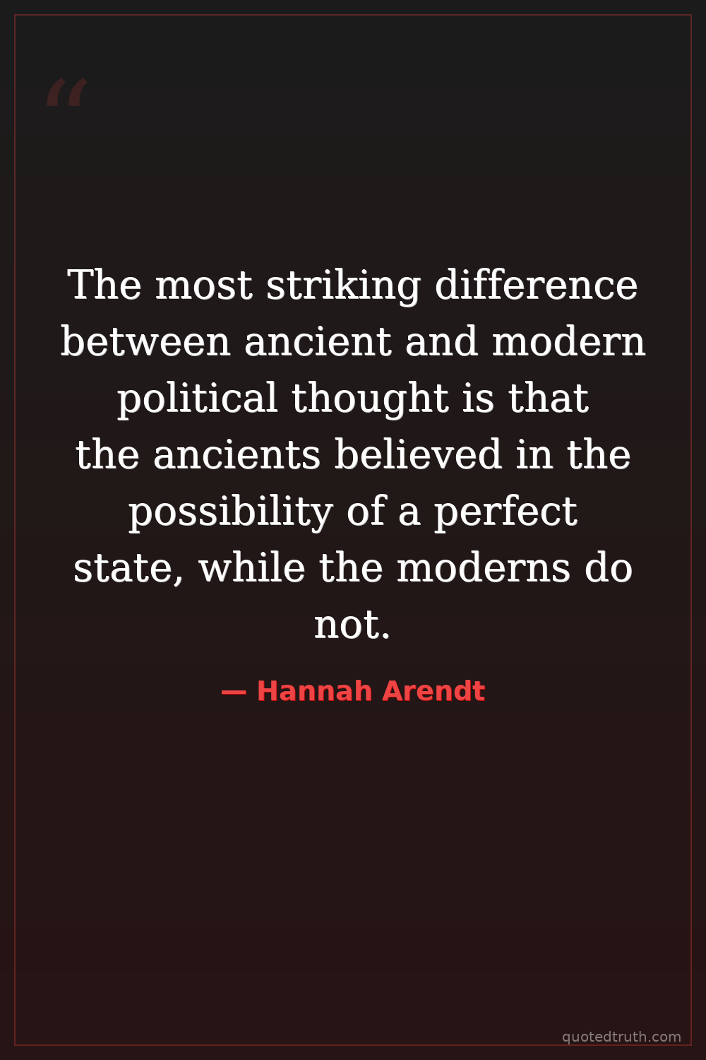 The most striking difference between ancient and modern political thought is that the ancients believed in the possibility of a perfect state, while the moderns do not.